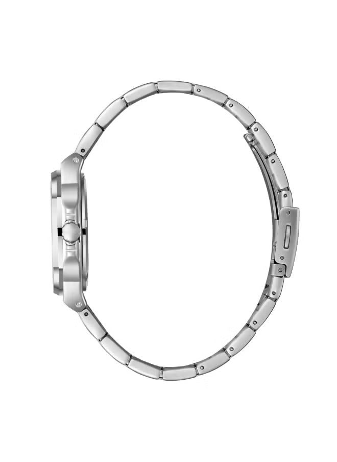 The case and bracelet are finished in a sleek silver-tone stainless steel, offering a bold contrast to the deep blue dial – a signature of the Nautilus collection. The dial features luminous hour markers, a date display, and a finely detailed horizontal embossing that captures light from every angle.